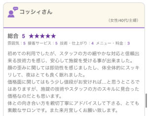 体との向き合い方を親切丁寧にアドバイスして下さる、とても素敵なサロンです。また来月宜しくお願い致します。